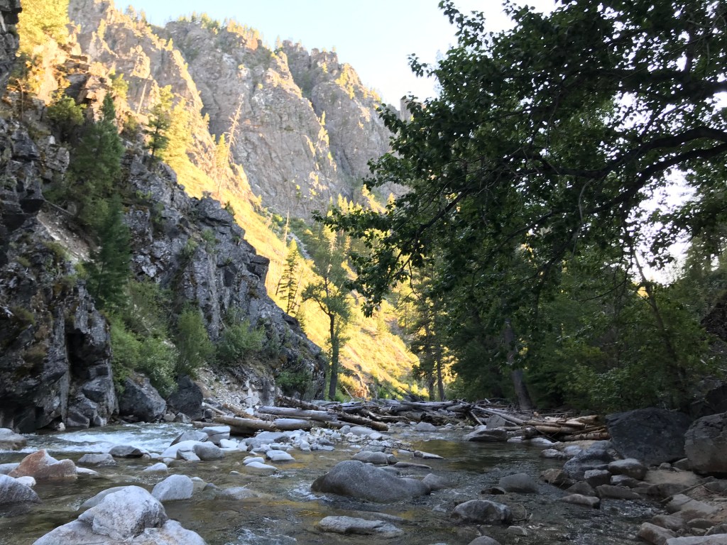 I hiked about two and a half miles up and back in the canyon in the late afternoon, with the setting sun providing excellent lighting as I made my way back through the gorge to the trailhead. On a day where the temperature brushed 90° in Boise, the shade and cool mountain waters of the North Fork was a rejuvenating relief.