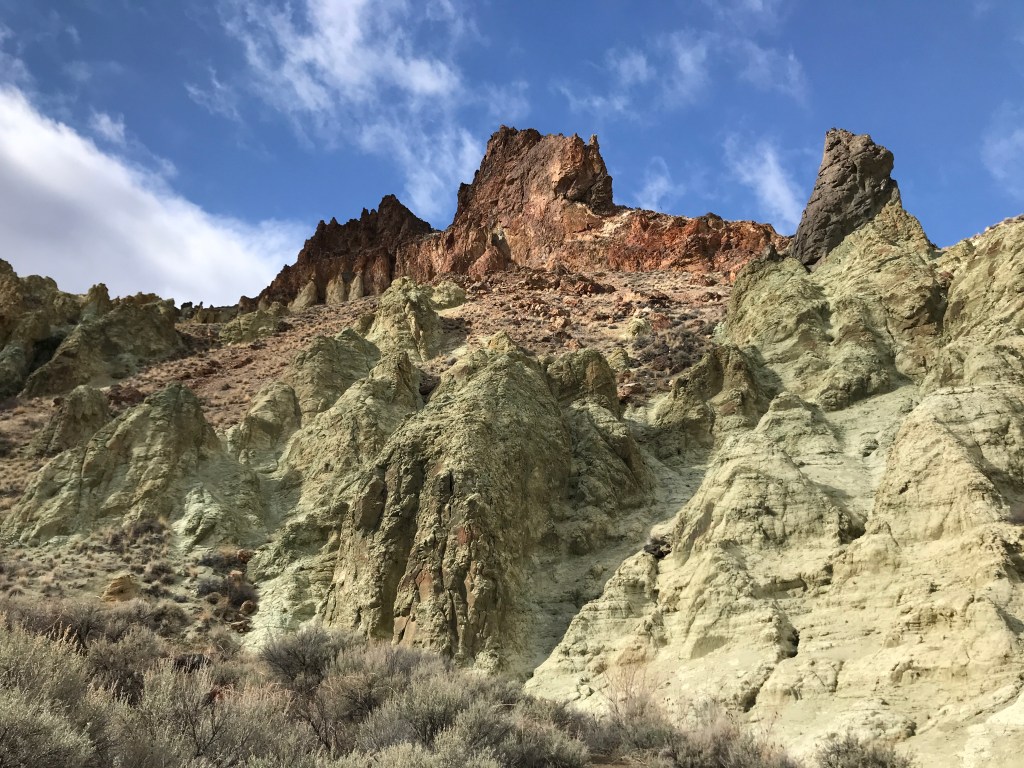 The canyon then widens and the colors turn from red and orange to tan and sandy brown. Here, the creek ambles through a flat valley in a wide amphitheater with a few possible campsites for those interested. The sandy slopes around the creek are where we found the most interesting rock specimens on our trek, including a thunderegg! We ventured a little further up the creek but turned around when the path disappeared into giant sagebrush, which is why I’m suggesting ending the outbound here, 2 miles from the trailhead.