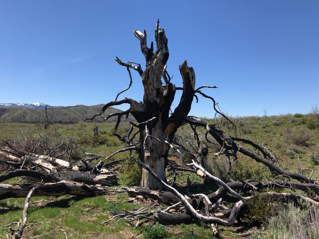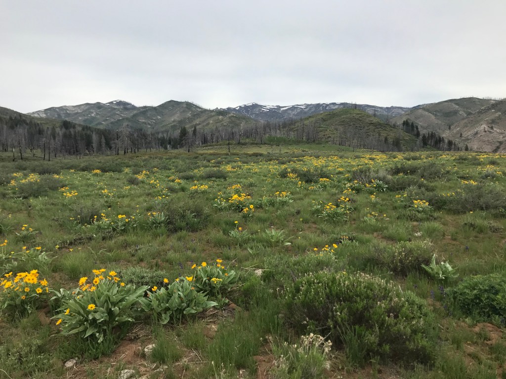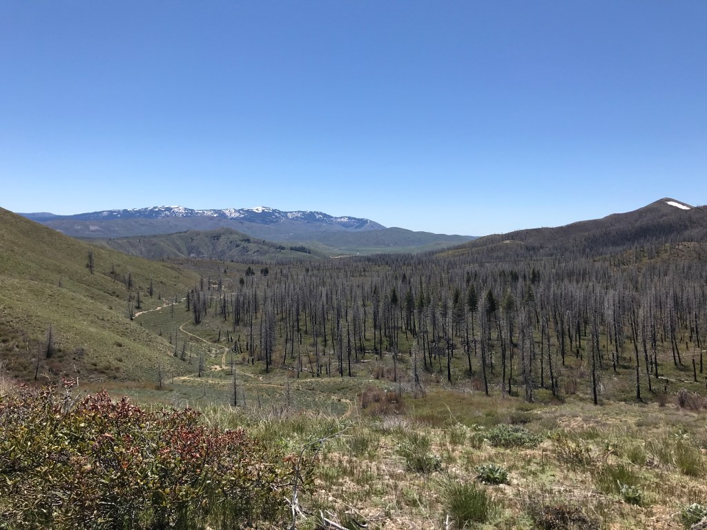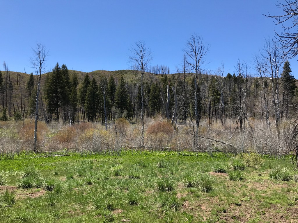 After skirting the edge of the meadow for 0.3 miles, you’ll arrive at the fork in the trail. I’d recommend hiking the loop clockwise, as the elevation gain is more gradual and the views are better in this direction. Taking the left fork, you’ll immediately cross Little Wilson Creek, an easy hop, skip, or jump. The next mile and a half traverses the wide-open terrain of the plateau, gradually ascending to pine stands that the Elk Complex forest fire burned severely in 2013. While trees haven’t yet made a comeback here, bushes, shrubs, wildflowers, and ferns are flourishing in the direct sunlight. Countless birds and rodents have made a home in the contorted super-bloom of plant life.