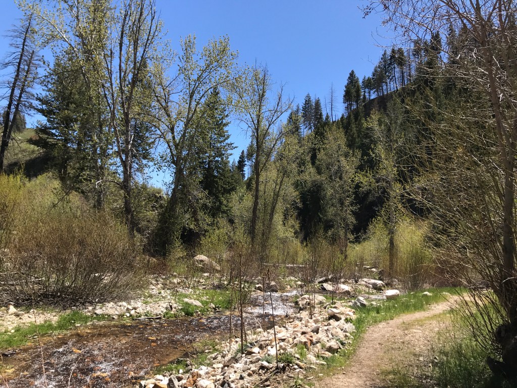 The trailhead is located at the inlet where Wilson Creek tumbles into the reservoir. For 0.6 miles, the trail meanders along the creek, which is well-shaded by cottonwoods and pines and lined with bushes and wildflowers. Here, hundreds of butterflies floated around us in mid-May 2022. There are creek crossings at 0.4 and 0.5 miles, both of which are shallow enough to walk through in high-top boots. There are strategically placed rocks and logs for those intending to stay completely dry. At the first crossing, we saw a large trout attempting to spawn up the creek as we traversed it.