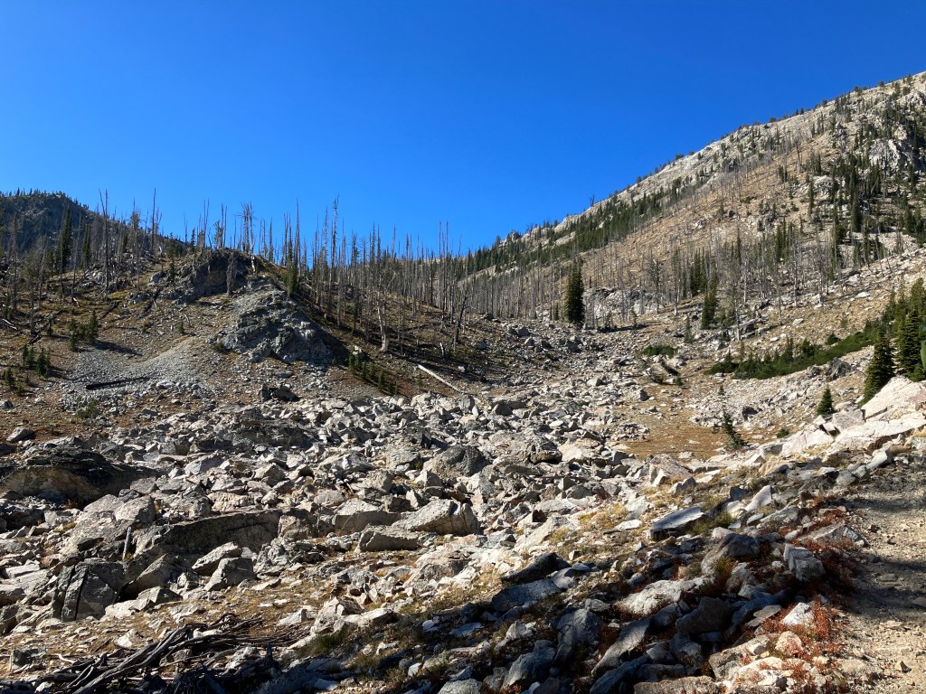 A quarter of a mile further up the main trail, you’ll come to an intersection. The trail to the right leads up and over a saddle to the Finger Lakes and eventually Fall Creek. Continue straight/left to stay on the route to Ruffneck Peak. If you need water, the last reliable source to filter from is a small pond coming up on the right. 0.3 miles after the intersection, the trail skirts around a huge rockfall and begins climbing to a high saddle south of the peak. I’d recommend taking a hydration break and eating a snack to prepare for the 700-foot gain ahead of you. This is the most severe burn scar and offers very little shade, so it may be time to re-up on sunscreen too.