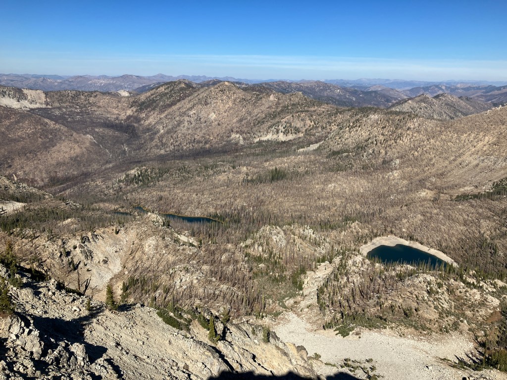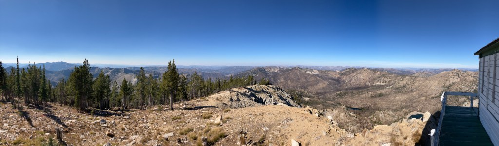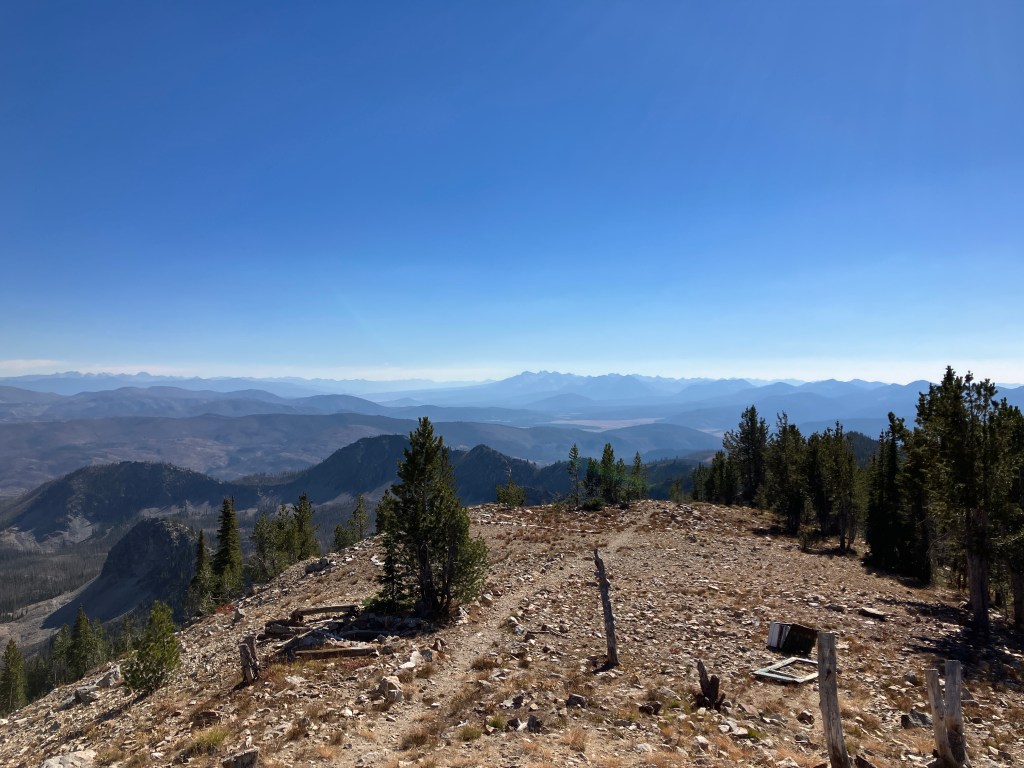 Near the saddle, you’ll traverse a few switchbacks. The elevation gain is relentless, but you’ll be rewarded by ever-improving views of the lake basin and several mountain ranges to the east. As evidenced in the picture below, some of the lakes are seasonal and will be dried up later in the year. Once on the saddle, you’ll be able to see for miles west into the Middle Fork Salmon River drainage as well. When you’re ready for the summit push, continue north on the well-shaded trail to the lookout. The final ascent is much more gradual and will feel easy with the saddle climb behind you.