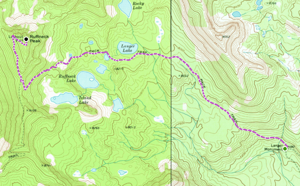 Langer Lake Trail starts at the Langer Monument, dedicated to forest ranger Charley J. Langer, pilot Bill Kelly, and copilot Arthur A. Crofts, who were killed on April 5th, 1943 in a nearby plane crash while conducting a search and rescue mission for survivors of an army bomber that crashed elsewhere in the central Idaho wilderness. Near the marker is a wilderness area permit box – please sign in when entering and out when leaving, then look for the steeply-ascending trail a few steps to the right. The route begins with a fairly arduous climb, gaining 700 feet in a mile, alternating between shade and exposure. Personally, I think it’s great to get a quarter of the overall gain out of the way when your legs are fresh.