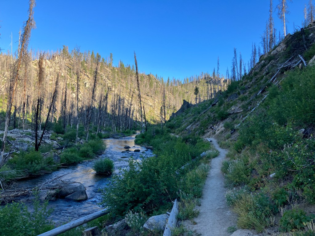 Despite its near obliteration by the 2016 Pioneer Wildfire, the Crooked River is one of my favorite trails in the Boise National Forest. For several miles, it meanders along the flat river, passing prime fishing holes, superb backpacking campgrounds, and stubborn stands of surviving pines, all framed by an explosion of wildflowers and grassy slopes. Come here late in the day in the early summer when the setting sun paints the rocky hillsides gold and you’ll understand my adoration.