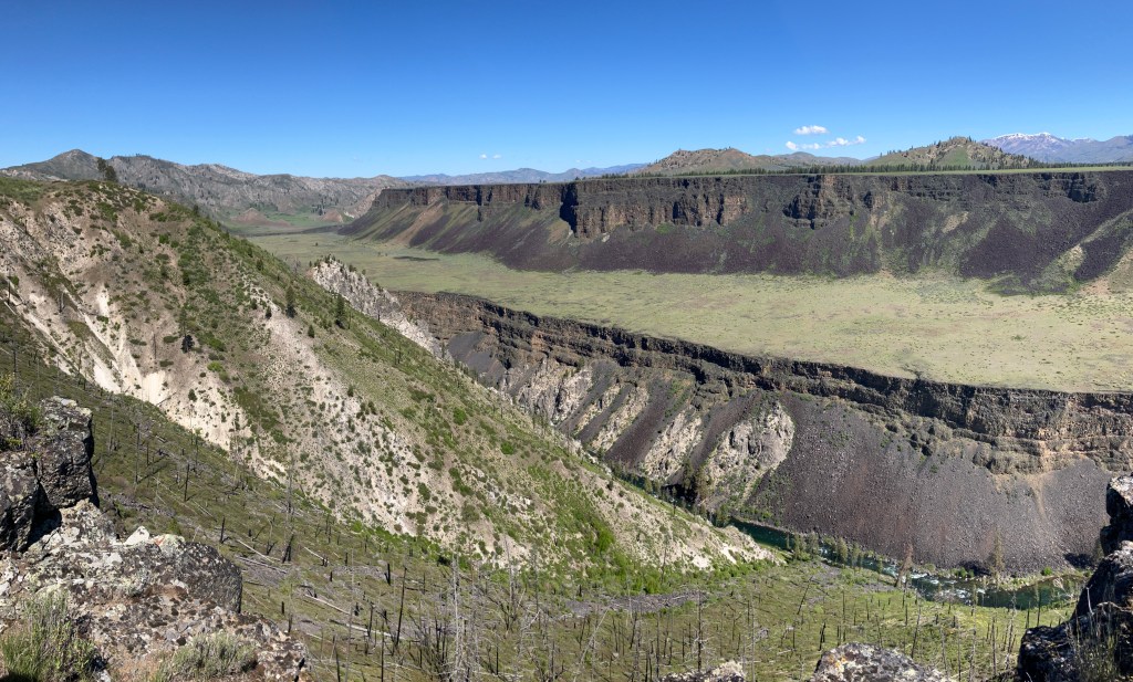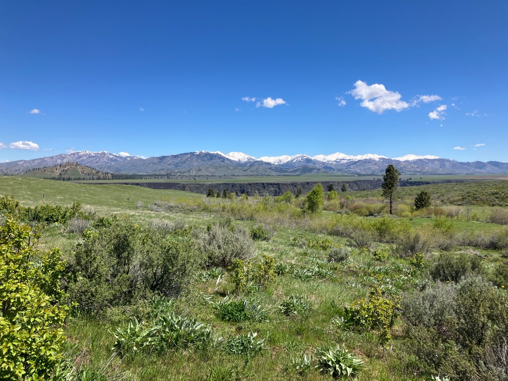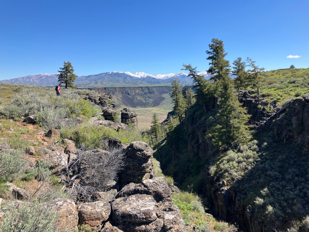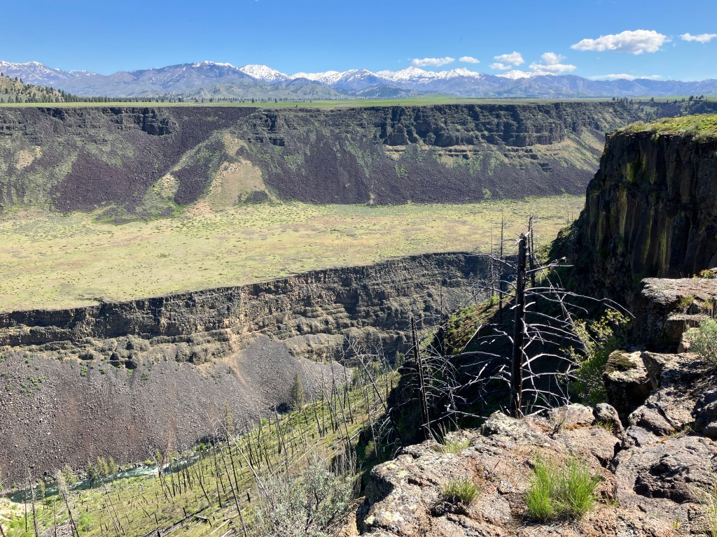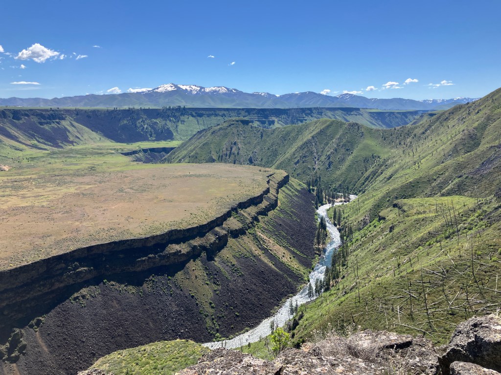 I’d highly recommend following a series of use trails to the promontory point 0.3 miles east, where astonishing panoramic views unravel. From left to right, the major peaks visible are Grape Mountain, Lava Mountain, Trinity Peak, and House Mountain. In front of you, the impossibly flat Smith Prairie sprawls, oxymoronic to the otherwise rugged, mountainous topography. 875 feet below you, the Boise River tumbles through the spectacularly carved canyon.