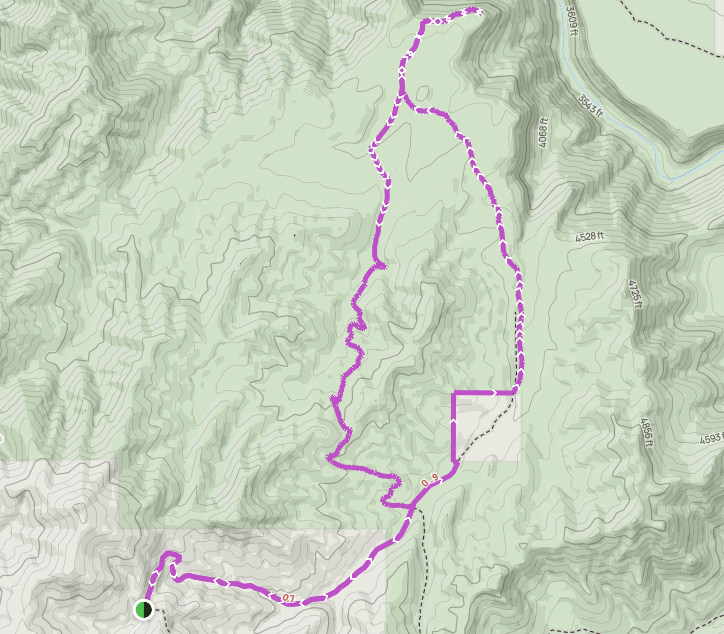 At 6.9 miles, you’ll reach a saddle and begin descending into the first drainage towards the four-way intersection. This shady section is a nice respite from the unrelenting exposure of the last few miles. At 7.7 miles, turn right to remain on Trail #340 again and return to the trailhead, 1.6 miles and 660 feet of elevation gain ahead.